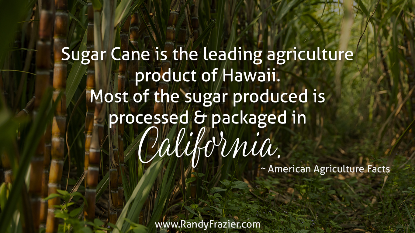“Sugar Cane is the leading agriculture product of Hawaii. Most of the sugar produced is processed and packaged in California.” ~ American Agriculture Facts