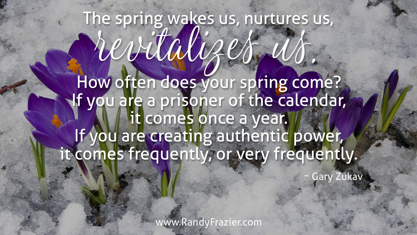 “The spring wakes us, nurtures us, revitalizes us. How often does your spring come? If you are a prisoner of the calendar, it comes once a year. If you are creating authentic power, it comes frequently, or very frequently.” ~ Gary Zukav