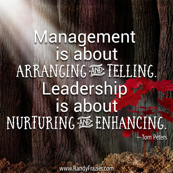 What is the difference between leadership and management? “Management is about arranging and telling. Leadership is about nurturing and enhancing.” ~ Tom Peters