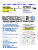 “. . . the most inspirational 4 hours of my life.” “. . . was effective and had an important message.” “. . . Inspired me to make courage a priority in my life.” “. . . moved me to become a better Leader and better Father, and better person!” “. . . has encouraged me to stay focused — to stand for what is right, my values, and convictions.” “. . . was very informative.” “. . . was outstanding, inspirational and just what I needed. Great job.” “. . . was needed by all.” “. . . provided a useful framework for being a mindful and proactive leader.” “. . . was well worth my time.” “. . . was engaging.” “. . . sparked my passion.” “. . . fully kept my attention and exceeded most sessions like these that I have attended.” “. . . was very valuable.” “. . . honest, comfortable, very good.” “. . . was very informational.” “. . . will make a positive difference in my life.”